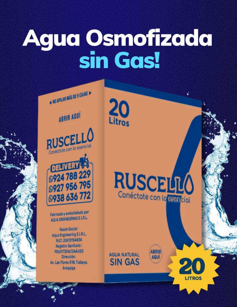 En RUSCELLO nos especializamos en la producción y distribución de agua embotellada de la más alta calidad, diseñada para garantizar pureza, frescura y confianza en cada entrega. Nuestros procesos cumplen con los más estrictos estándares de seguridad e inocuidad, asegurando un producto saludable y confiable para el consumo humano.